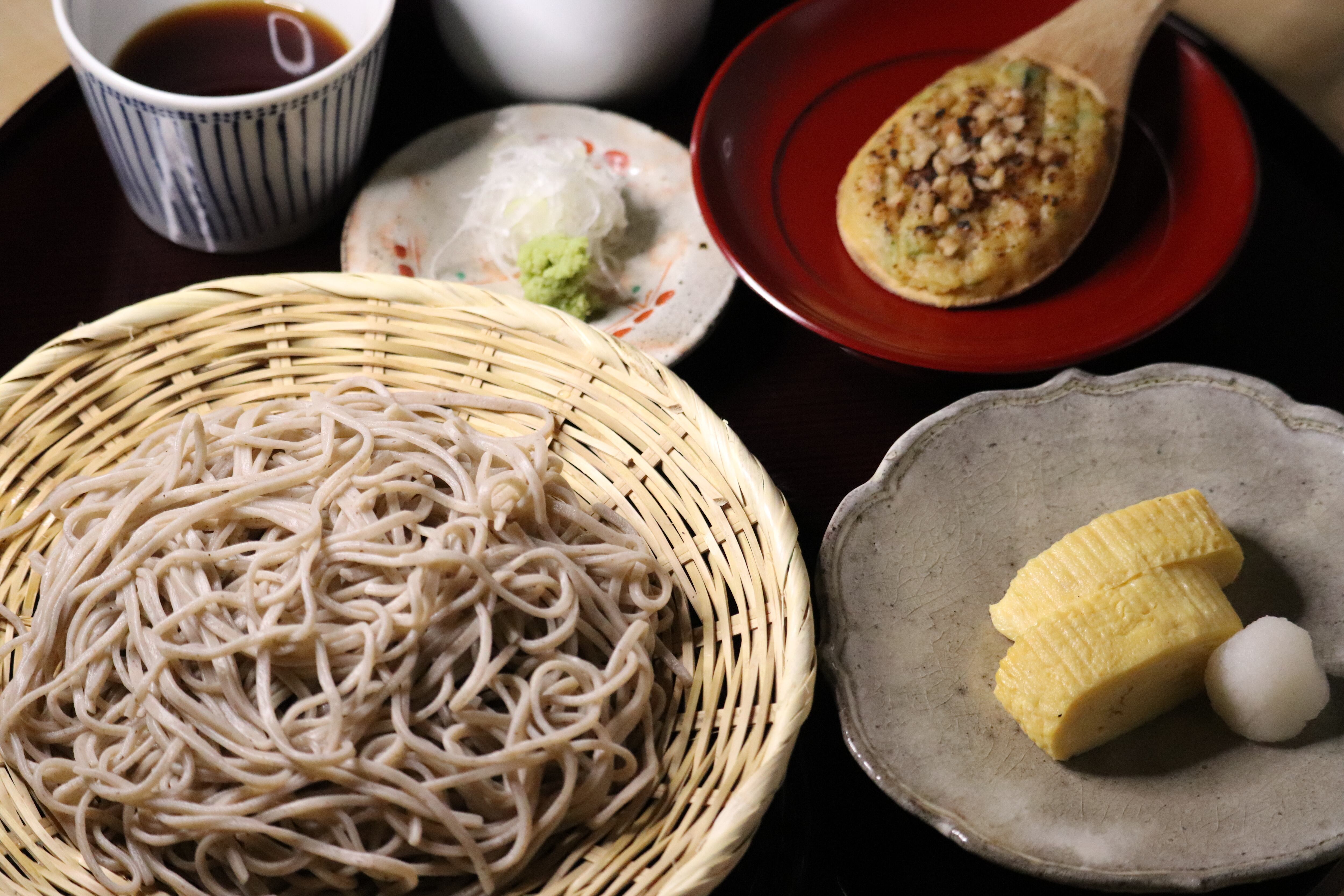 玉子焼き 蕎麦味噌でお酒をたしなみ そばをいただき